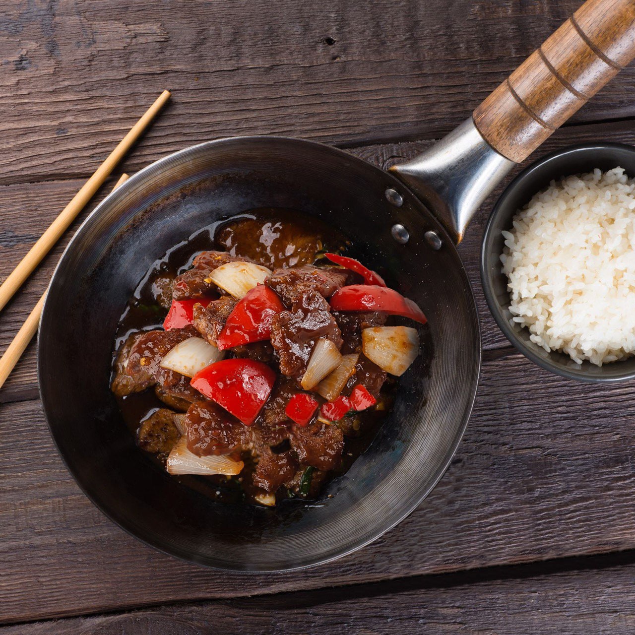 Обжаренные в воке ломтики вырезки говядины со сладким перцем, чесноком и луком в пряном сладко-остром соусе.